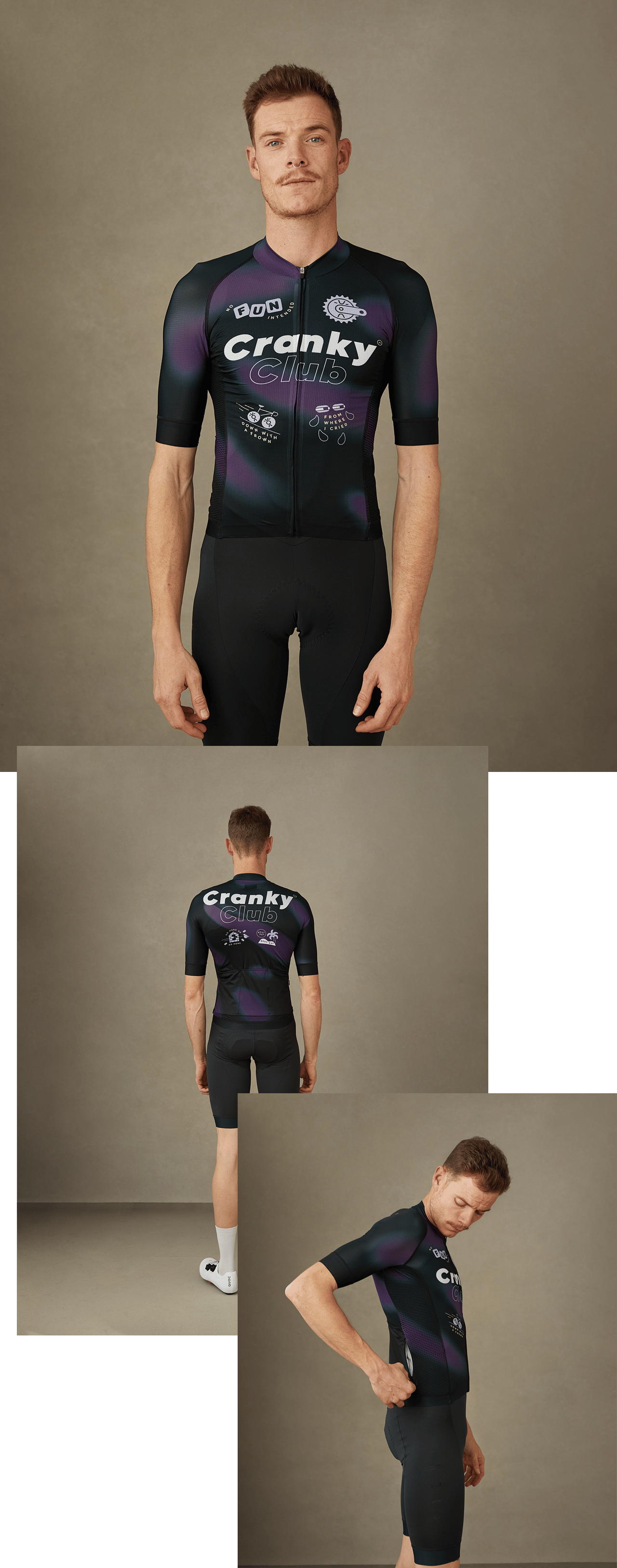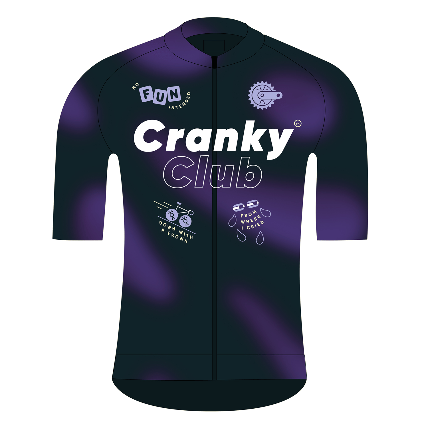 The time has come: the official Cranky Club jersey. Now everyone can see that you are the crankiest around. Don't cycle too fast with this badboy on, it is also made to flex.